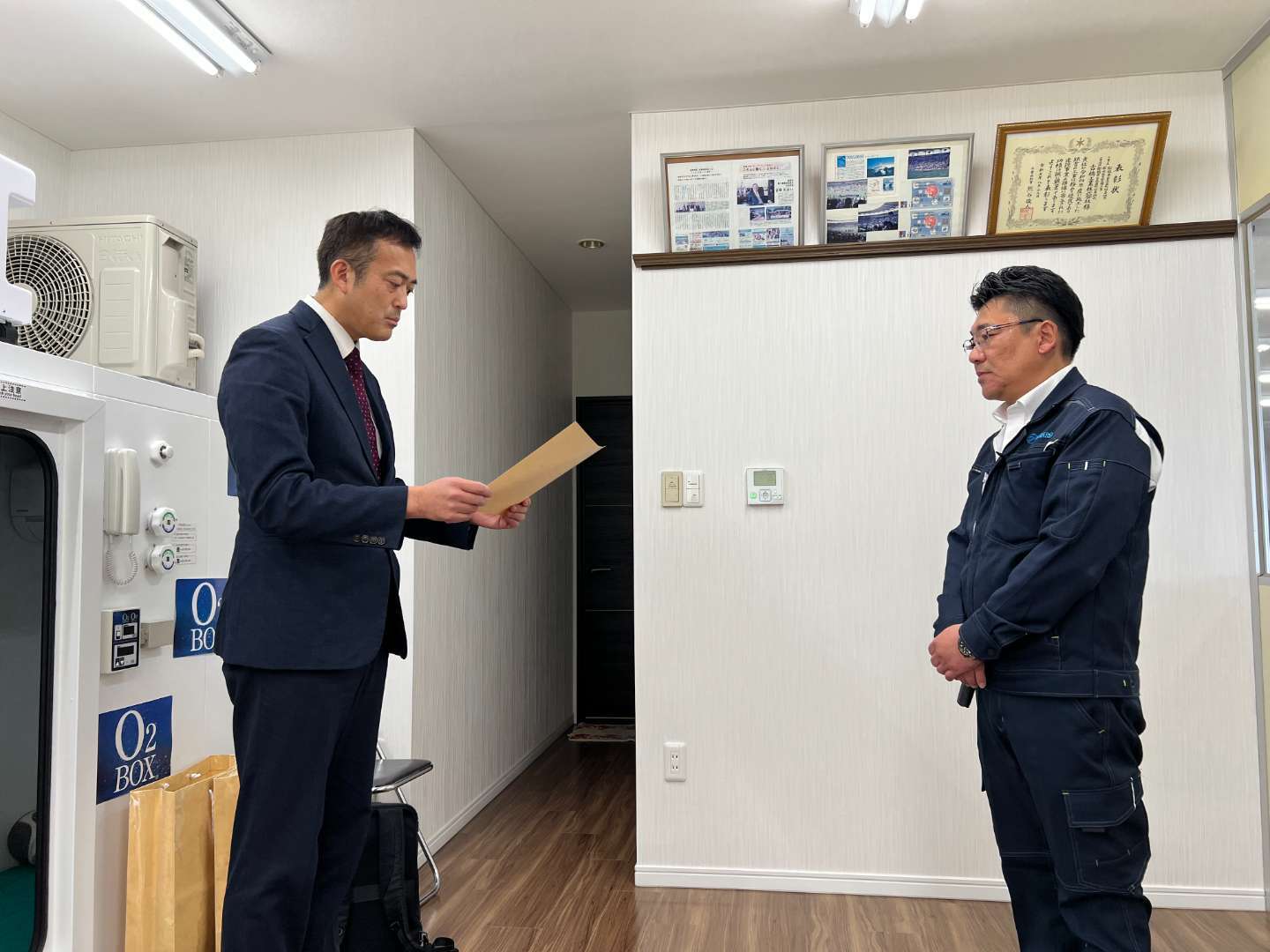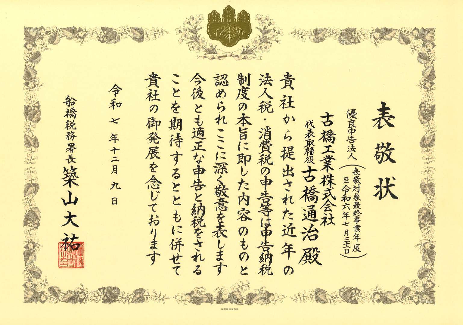 2025年12月9日(火)に船橋税務署様より優良申告法人として表敬を受け、表敬状をいただきました。